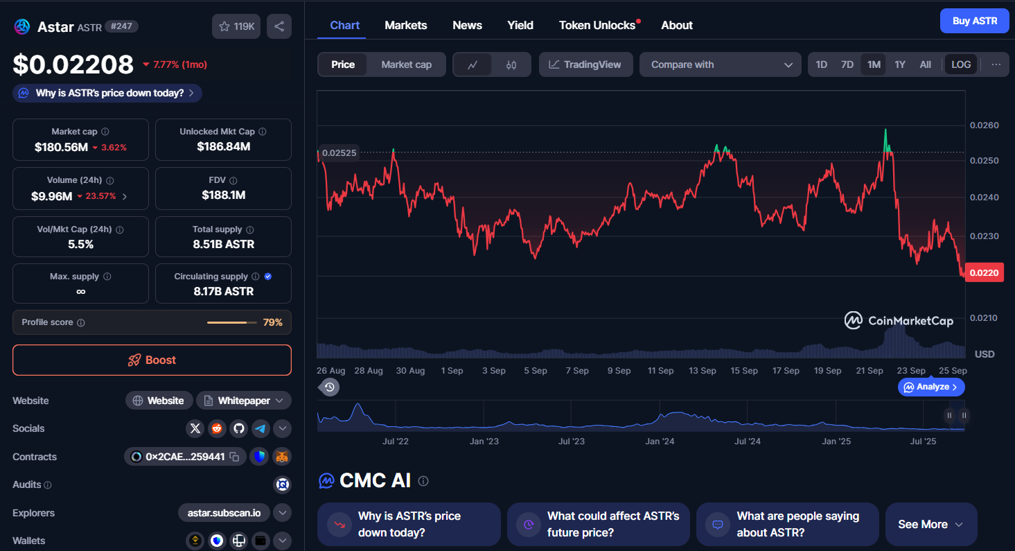 - ATL (کف تاریخی): تقریبا 0.032 دلار (اکتبر ۲۰۲۳) و قیمت فعلی حتی زیر ATL ثبتشده معامله میشود؛ یعنی ASTR اکنون در پایینترین محدودههای تاریخی خود قرار دارد.