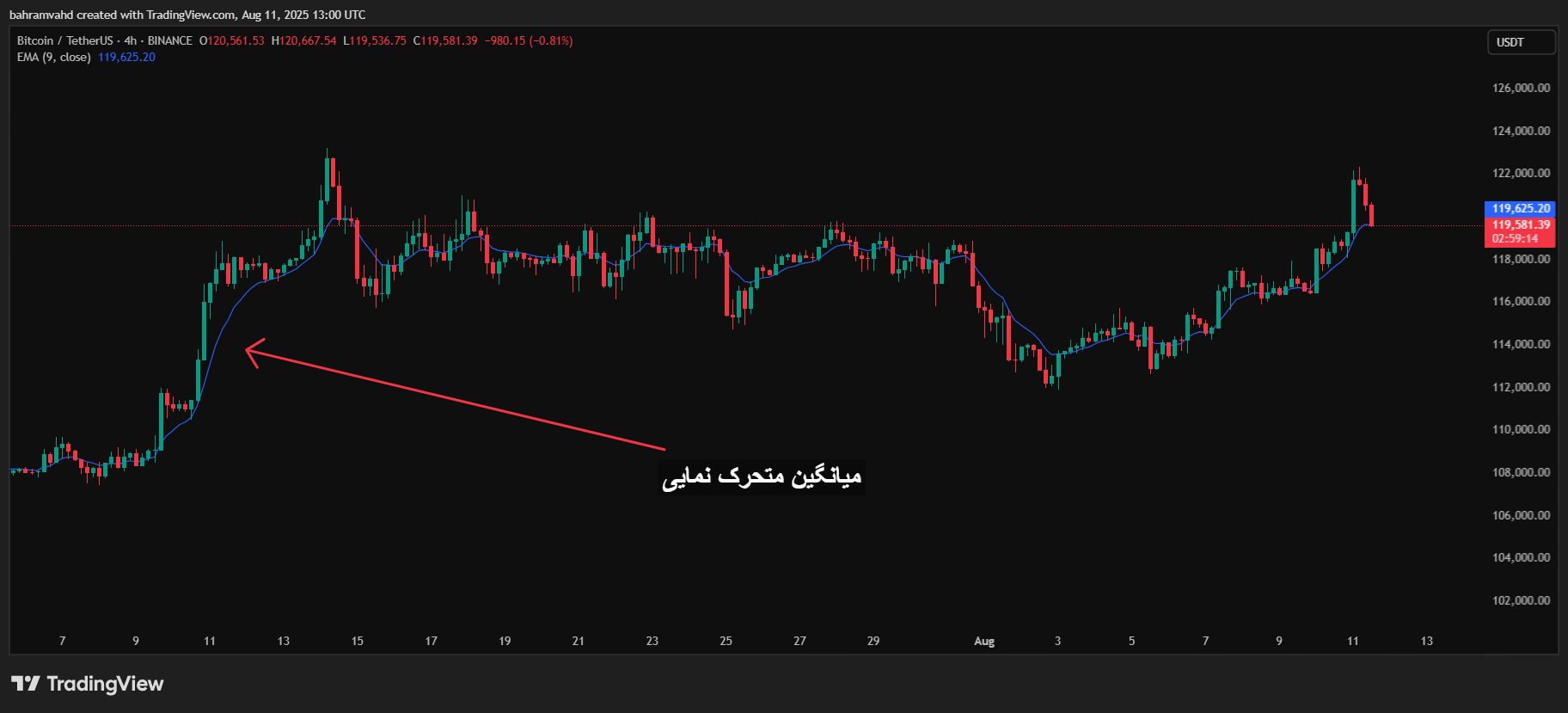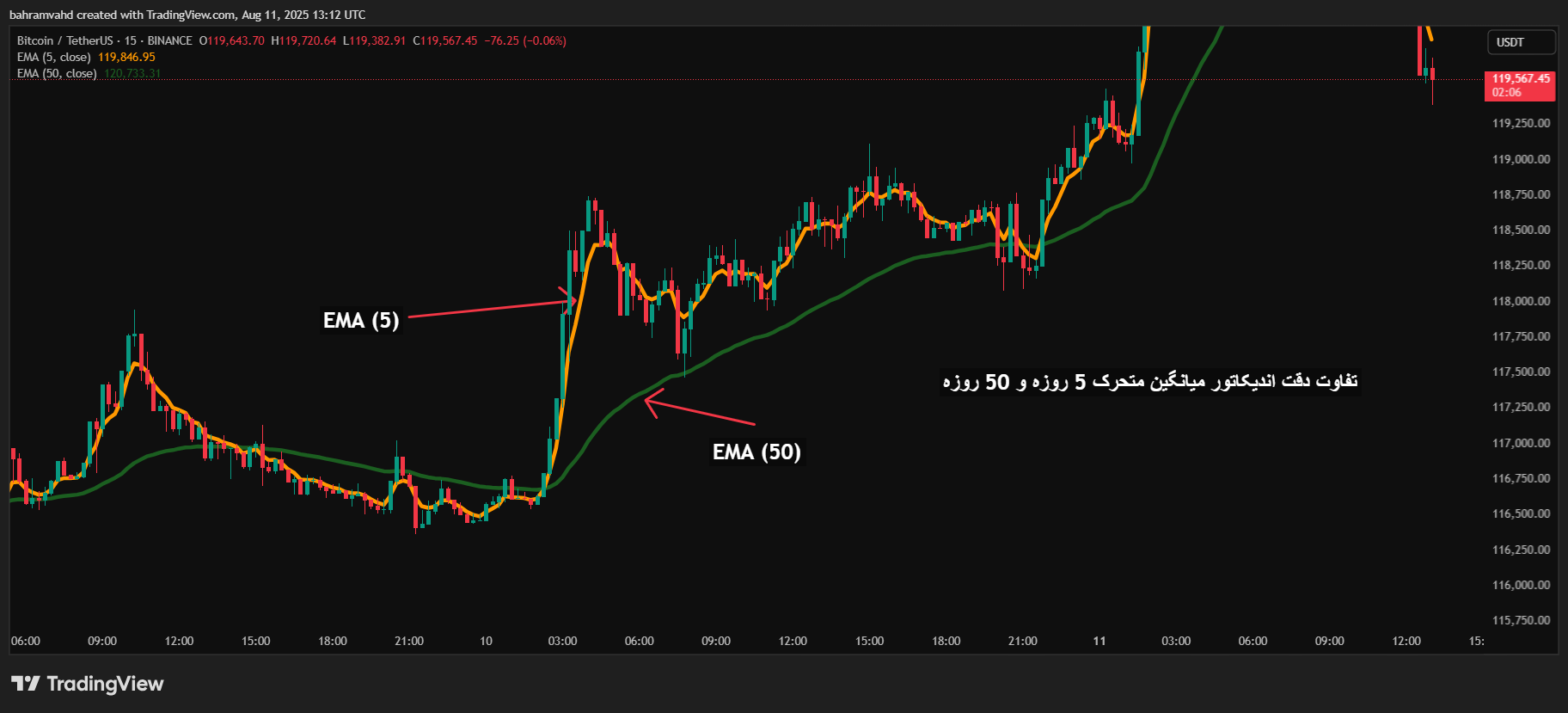- میانگین متحرک کوتاهمدت (EMA5 یا EMA9): بسیار سریع واکنش نشان میدهد و در بازارهای پرنوسان سیگنالهای کاذب زیادی دارد.