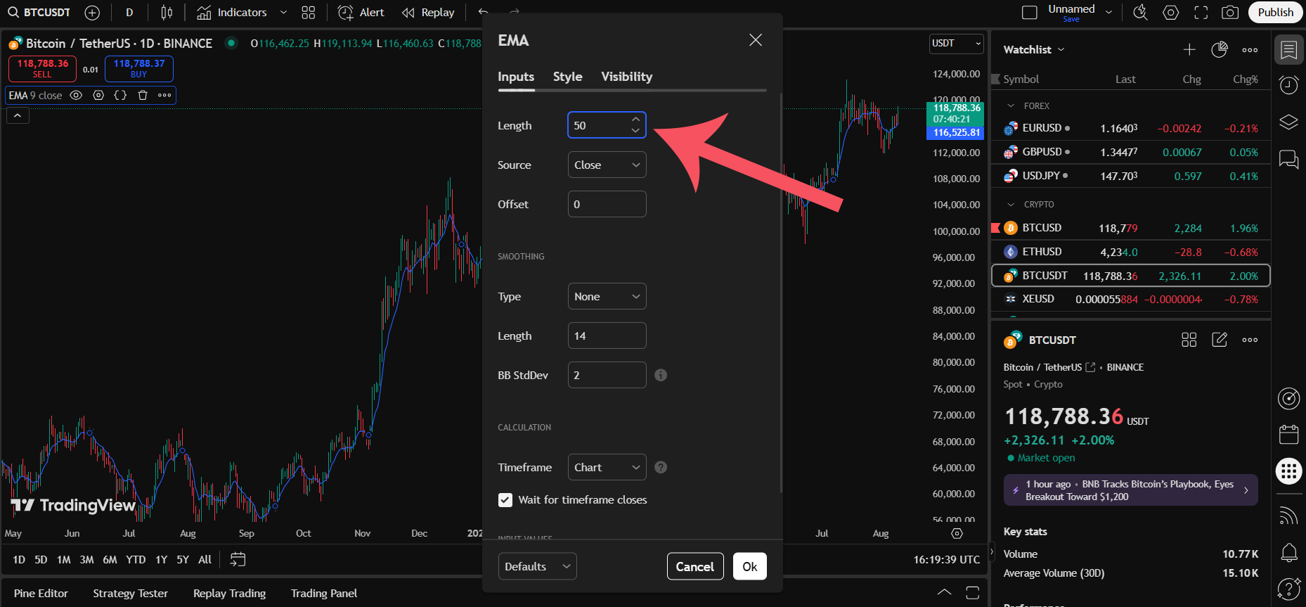 در تنظیمات اندیکاتور، طول (Length) را به 50 تغییر دهید.
