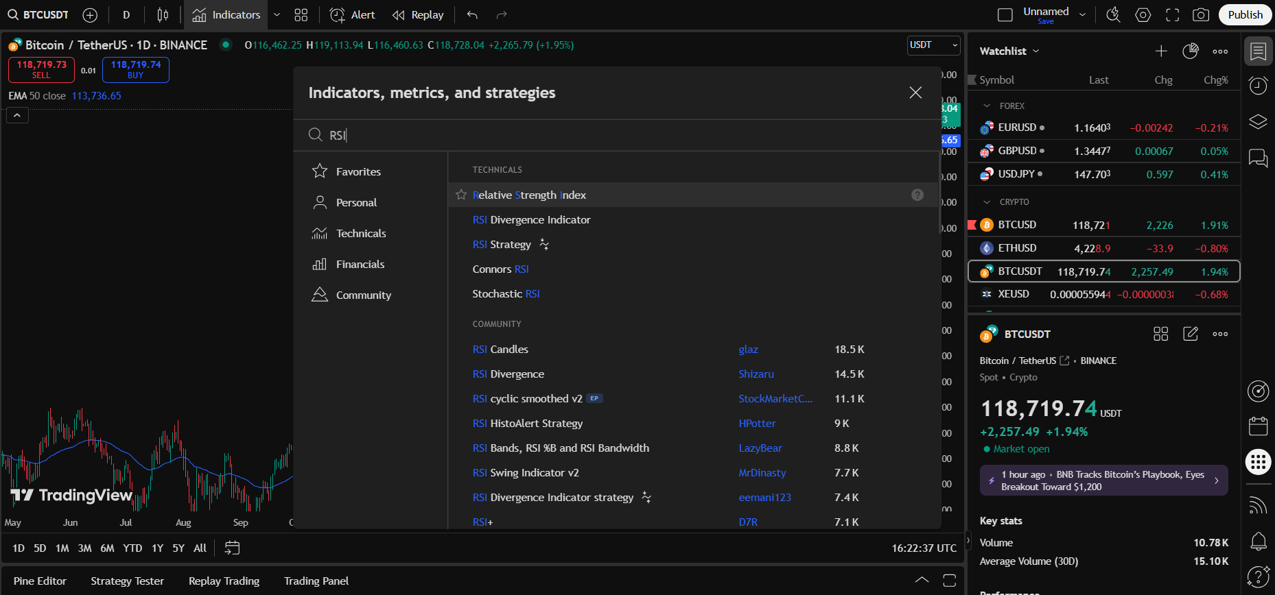 برای اینکه بتوانیم مفهوم «روباست بودن» را بهتر درک کنیم، بیایید یک نمونه عملی را با دادههای واقعی در TradingView بررسی کنیم. اندیکاتورهای انتخابی: