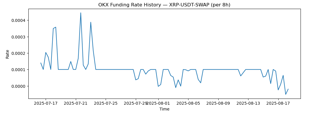 یکی از شاخصهای مهم برای درک احساسات بازار، فاندینگ ریت (Funding Rate) است. بررسی دادههای اخیر در صرافی OKX نشان میدهد که نرخ فاندینگ XRP در جولای ۲۰۲۵ چند بار به بالای ۰.۰۰۴ (۰.۴٪ در هر ۸ ساعت) رسید؛ سطحی که نشاندهندهی غلبه موقعیتهای لانگ و خوشبینی شدید تریدرهاست. در ادامه، کاهش تدریجی این نرخ تا محدوده نزدیک صفر نشان میدهد که هیجان بازار دوام زیادی نداشته و معاملهگران به سرعت به سمت تعادل برگشتهاند.