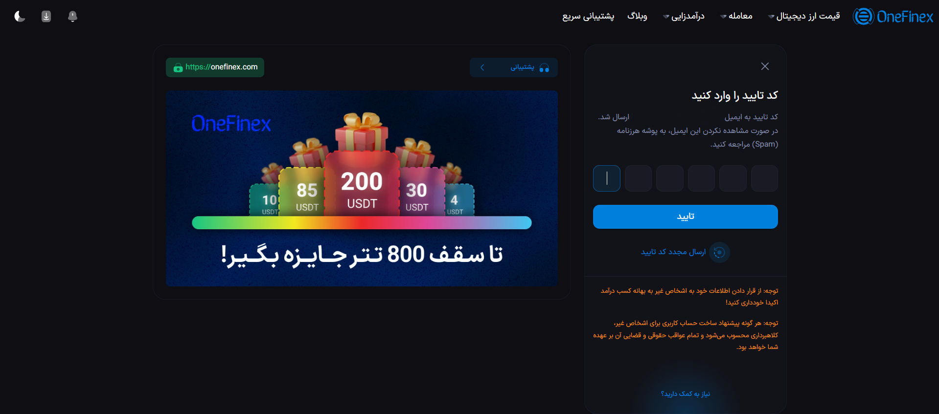 کد تایید ورود به وانفینکس برای شما ایمیل میشود. آن را وارد و تایید کنید.
