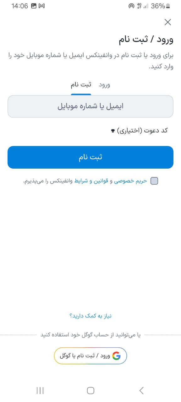پس از اینکه ایمیل یا شماره موبایل خود را وارد کردید، قوانین و شرایط وانفینکس را مطالعه و تایید کنید؛ در نهایت روی دکمه ثبتنام کلیک کنید. برای تجربه کاربری بهتر هنگام استفاده از صرافی، فیلترشکن را خاموش کنید.