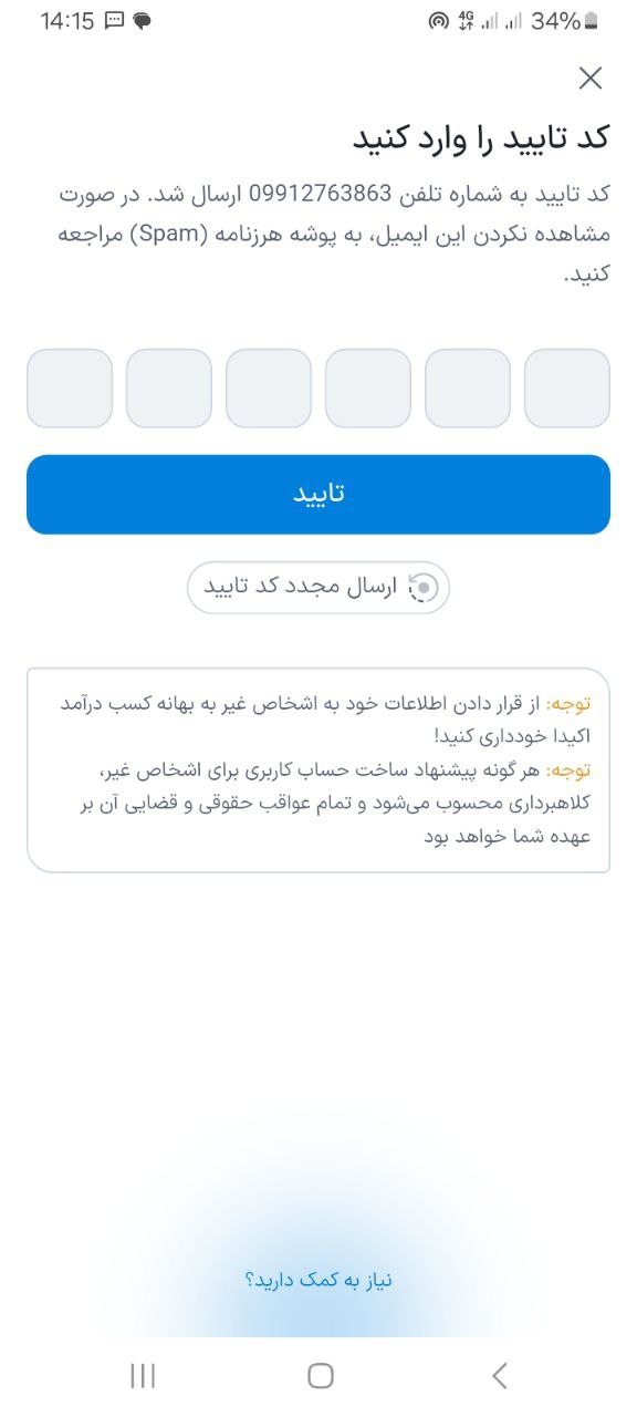 - تایید ایمیل یا شماره تماس: کد تایید برای شما به ایمیل یا شماره تماسی که ثبت کردید ارسال میشود. کافی است آنرا وارد کنید.