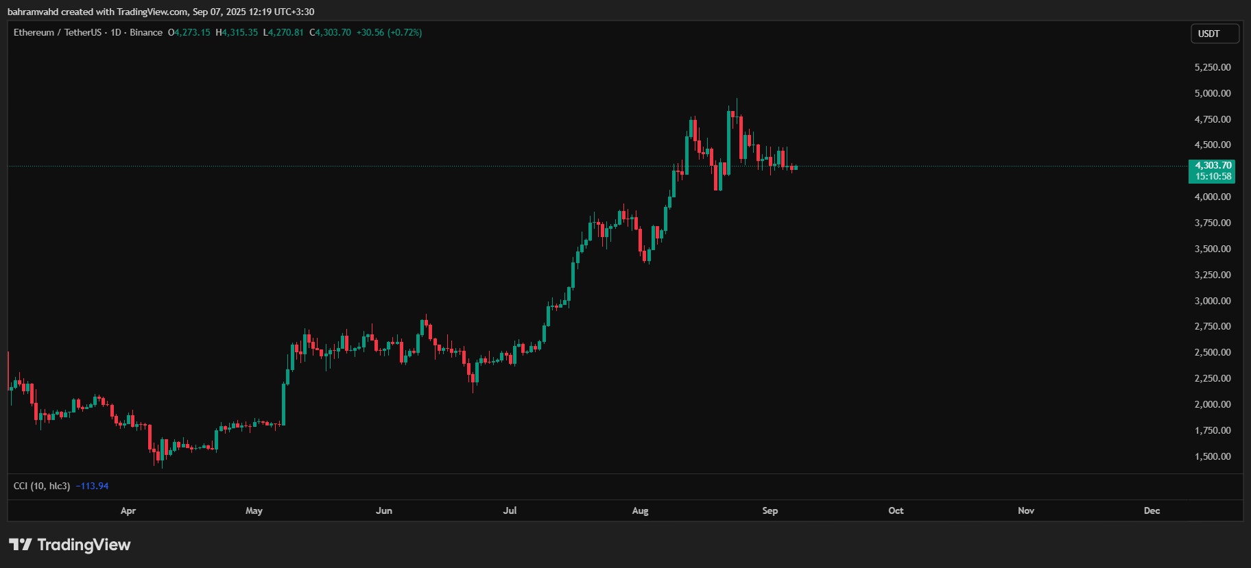 - اتریوم (ETH): اتریوم در ماه اوت به رکورد تاریخی ۴٬۹۵۰ دلار رسید و سپس کمی اصلاح شد. DeepSeek انتظار دارد روند صعودی ادامه یابد؛ تحلیلگران عقیده دارند که پاکسازی مقاومت ۴٬۴۹۰ دلار میتواند راه را برای حرکت به ۵٬۱۰۰ دلار باز کند. برخی تحلیلگران مستقل معتقدند در صورت ادامه رشد بازار و استفاده بیشتر از برنامههای دیفای، اتریوم میتواند تا پایان سال ۲۰۲۵ به محدوده ۷٬۵۰۰ تا ۱۲٬۰۰۰ دلار برسد.